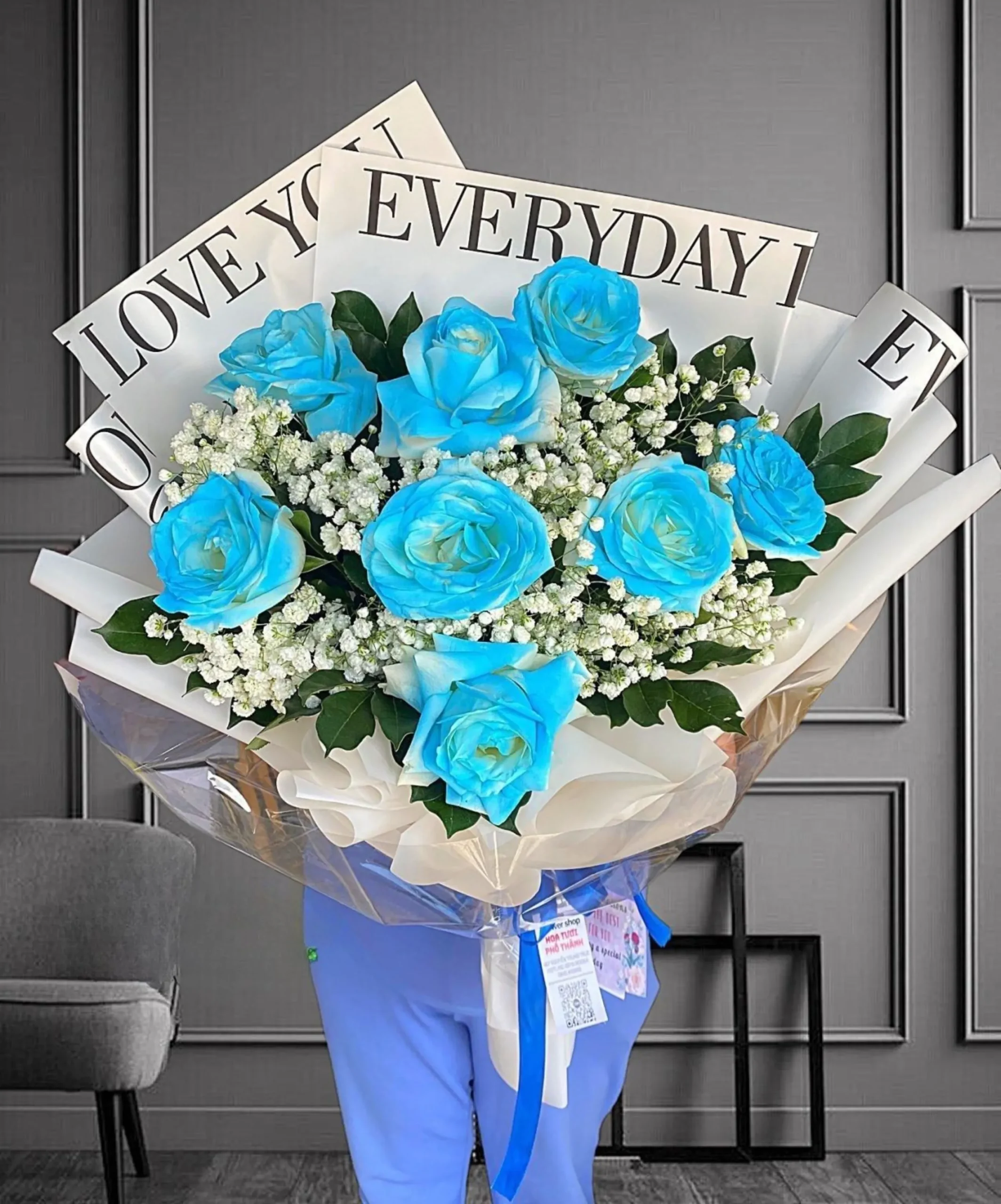 Một bó hoa hồng xinh không chỉ là món quà, mà còn là lời chúc tốt đẹp, là sự quan tâm chân thành bạn muốn gửi đến người nhận. Đặc biệt, màu xanh của hoa hồng tượng trưng cho sự vĩnh cửu và những điều kỳ diệu, kết hợp với baby trắng thể hiện sự ngây thơ và thuần khiết, tạo nên một thông điệp ý nghĩa và sâu sắc.