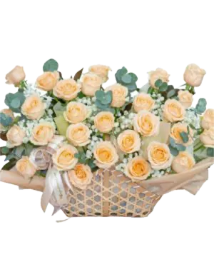 Màu kem dịu dàng của hoa hồng tượng trưng cho sự thanh khiết, lòng biết ơn và sự ngưỡng mộ. **Giỏ hoa xinh** này không chỉ là món quà vật chất mà còn là thông điệp yêu thương chân thành mà bạn muốn gửi gắm đến người nhận. Đây là món quà hoàn hảo để chúc mừng sinh nhật, kỷ niệm ngày cưới hay đơn giản chỉ là bày tỏ tình cảm.