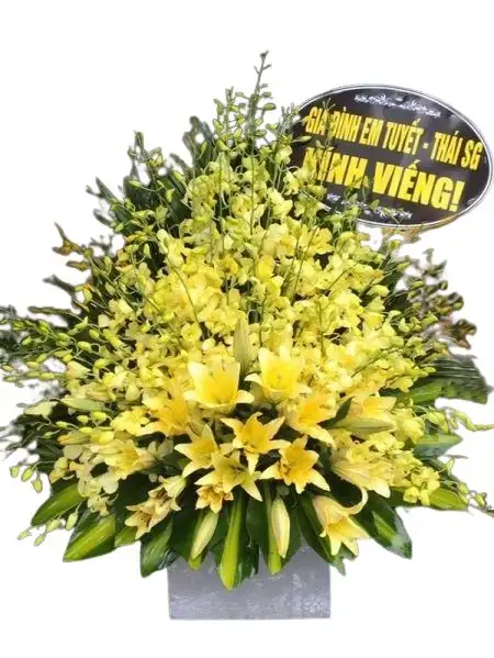 - Kệ hoa chia buồn với hoa lan, hoa ly, hoa cúc trắng.