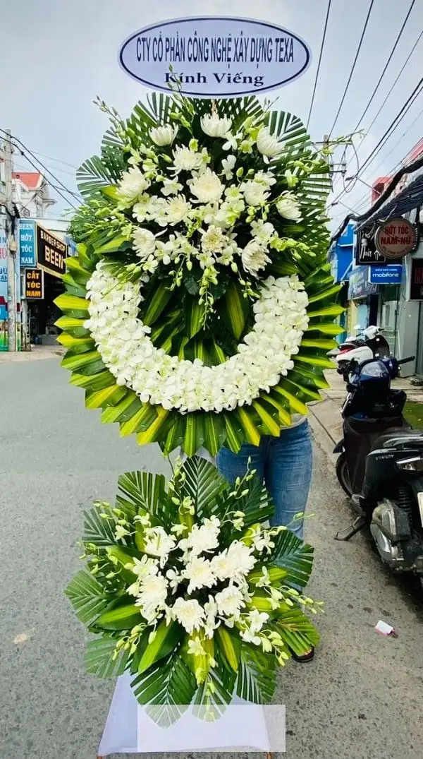 Vòng hoa viếng tang lễ, với hình dáng tròn trịa, tượng trưng cho sự vĩnh cửu và tuần hoàn của cuộc sống. Mỗi loài hoa được sử dụng trong vòng hoa đều mang một ý nghĩa riêng, góp phần tạo nên thông điệp ý nghĩa. Từ hoa cúc thể hiện sự kính trọng, hoa ly mang ý nghĩa chia buồn, đến hoa hồng trắng tượng trưng cho sự tinh khiết và nhớ thương. Chúng tôi hiểu rằng, kệ hoa viếng vẫn nhớ đến người, là cách để bạn gửi trọn tấm lòng.